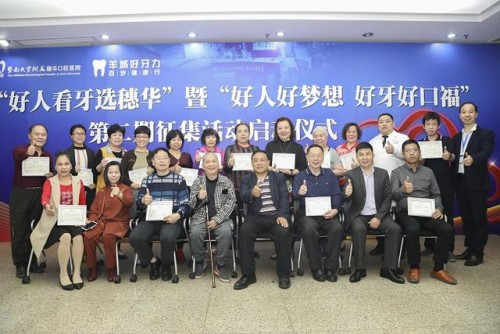 公益启动现场,医院向照顾瘫痪在床9年的缺失牙多年的广州好人、广州美家庭韩亚妹援助2万元种植牙基金,向广东好人肖锐成、广州好人江海英等好人支持一万、两万不等的种植牙基金。