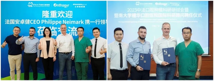 今年7月,安卓健CEO Philippe Neimark 携领团队莅临参访广州穗华口腔医院,双方亲切交谈,深度商讨了行业发展趋势。同时,为创造出更多新的科研成果和服务模式,广州穗华口腔医院还聘任法国安卓健CEO Philippe Neimark、法国安卓健工厂全球市场总监 Yanik Segginger 为国际科研顾问,进一步加深了双方的科研合作。